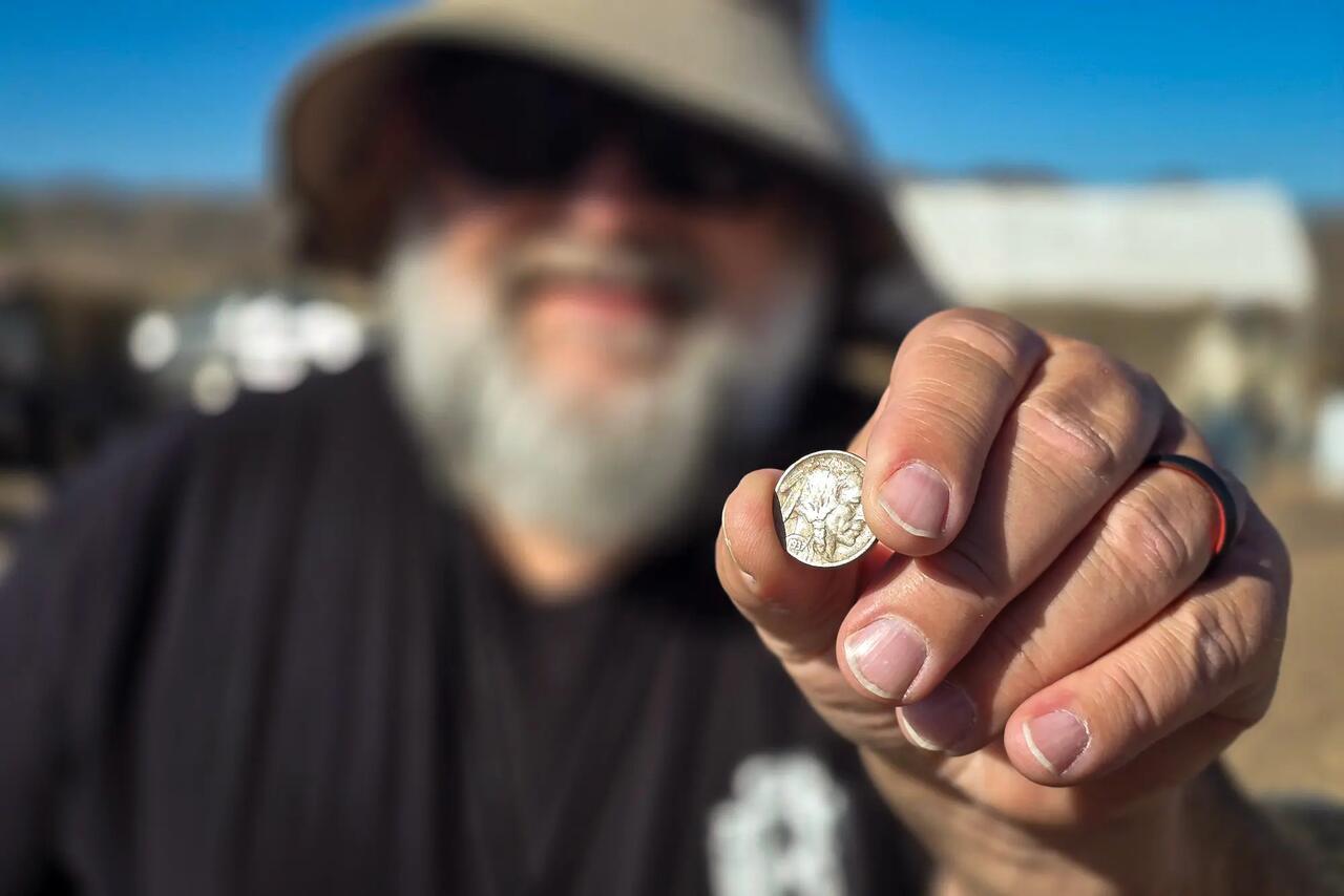 Bob Burgette, 62, holds up the 1937 Indian Head nickel he found with his Minelab metal detector during the annual Desert Gold Diggers spring club outing, near Tucson, Ariz., on March 22, 2025. Allan Stein/The Epoch Times