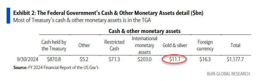 According to none other than BofA's heaviest of Fed plumbing hitters, former NY Fed staffer Mark Cabana, a gold re-marking could cause TGA to be paid down in ways that stoke macro activity, risk inflation, & add excess cash into the banking system (higher TGA would eventually move to higher Fed reserves or ON RRP balances). In essence, gold re-marking would ease both fiscal & monetary policy (all else equal).