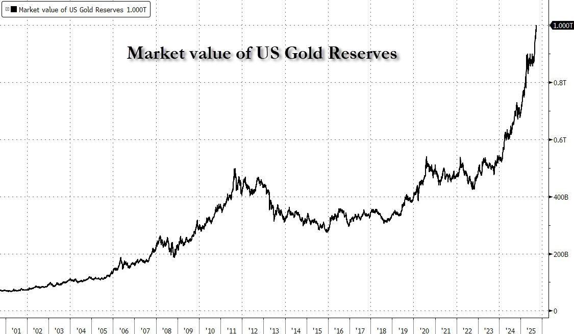 On the back of a 45% surge in the price of gold this year, the US Treasury's hoard of the barbarous relic has surpassed $1 trillion in value for the first time in history.
