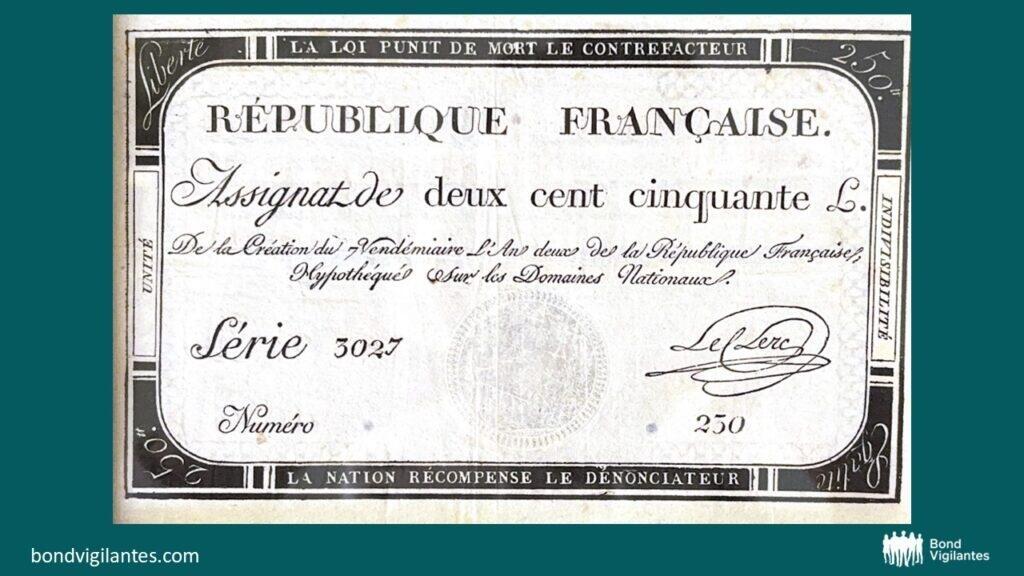 Central to Necker’s concept of debt finance was the establishment of a central bank along British principles and a beneficial partnership between sovereign and private investors. System and laws were all-important. He succeeded in raising substantial loans for the beleaguered King as the nation’s political scene deteriorated. His scheme worked for a while, but the debt he created expired worthless. Necker got the sack, the King met the guillotine and a popular government was installed. In its place came the revolutionary interest-free fiat currency called the Assignat. These bills came with a dark warning on their borders5: “Death to counterfeiters, and rewards to denouncers”.
