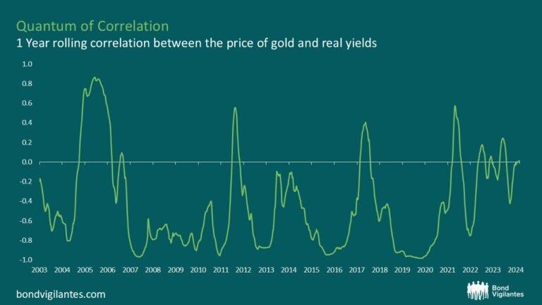 Of late though, once you dial in on the rolling correlation between the price of gold and the real yield of US Treasuries over the last 20 years, that relationship has begun to break down. In the last 5 years, the correlation has hovered around zero thanks to the recent rise in the gold price. So quite literally there is no correlation between the two assets (and we know there has certainly been market distress recently).