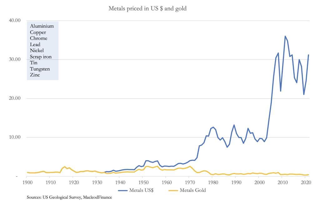 To illustrate this importance, the chart below shows average values for a range of industrial metals priced in dollars and gold, followed by a chart of oil similarly priced.