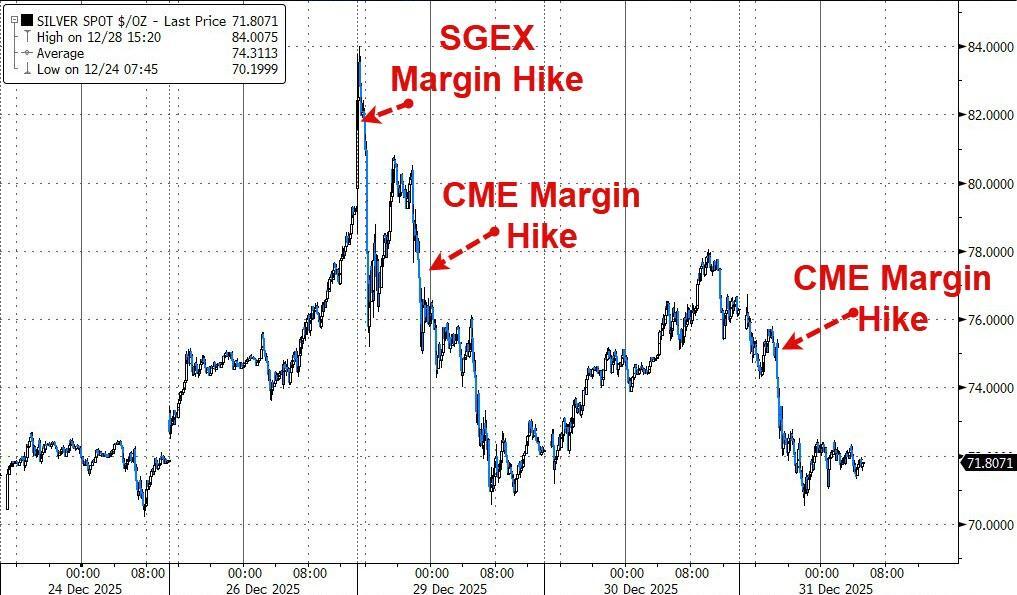 That 'volatility struck over the weekend with Monday's big price retreat: silver prices did take a significant downward presumably because of another increase in margin levels at the CME during a very illiquid time of year, and positions being adjusted, with initial margins jumping $3,000/oz from $22,000/oz to $25,000/oz. This followed an increase on Dec 12th, 2025, with a 10% increase in margins to the $22,000/oz level.