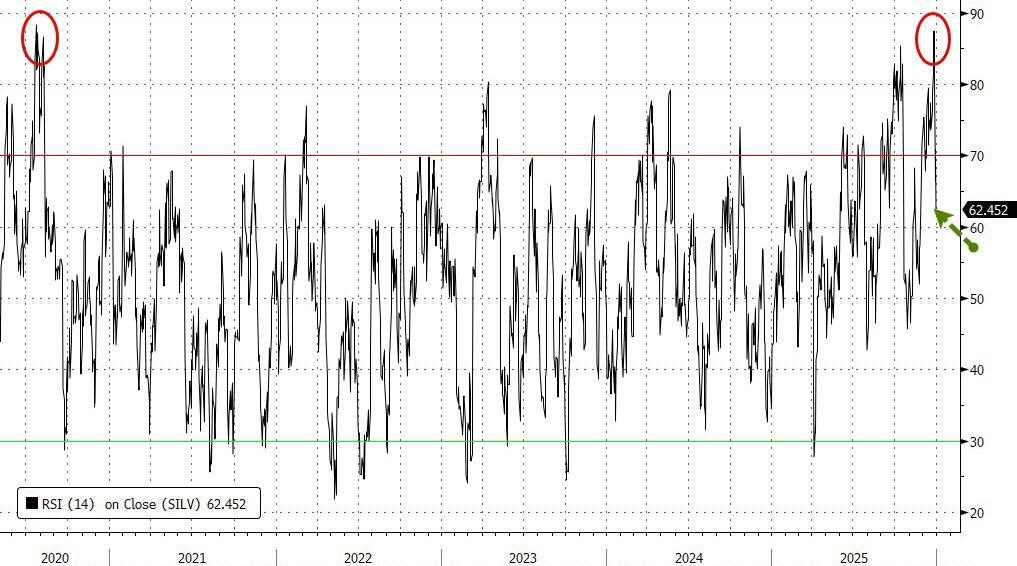 While there has been much talk of Silver being in a bubble, SocGen explained here why they disagree with the 'models', and we now note that silver no longer officially 'overbought'...