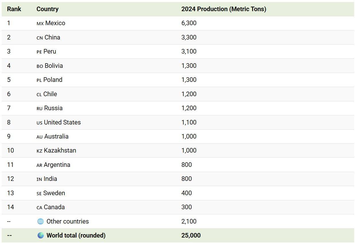 China ranked second globally, producing around 3,300 metric tons of silver in 2024. Much of this output comes as a byproduct of large-scale base metal mining, particularly lead and zinc.