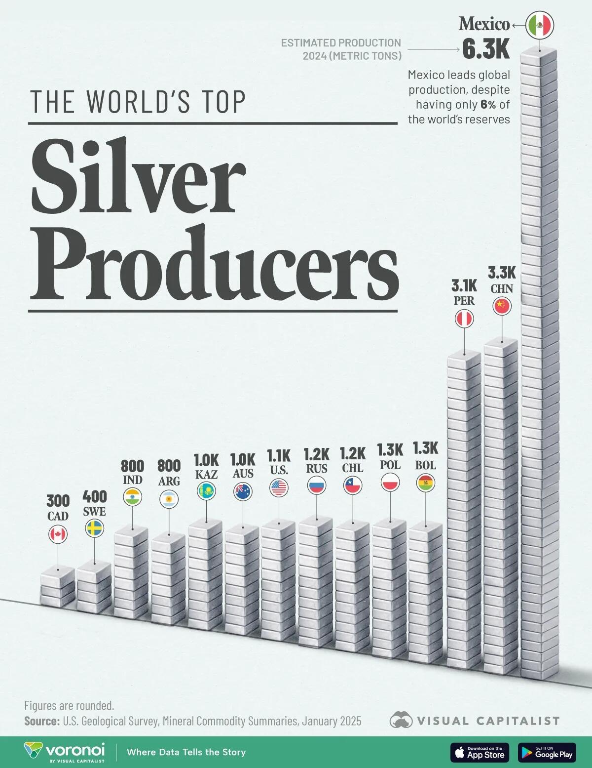 The data for this visualization comes from the U.S. Geological Survey’s Mineral Commodity Summaries 2025. It presents estimated silver mine production by country for 2024.