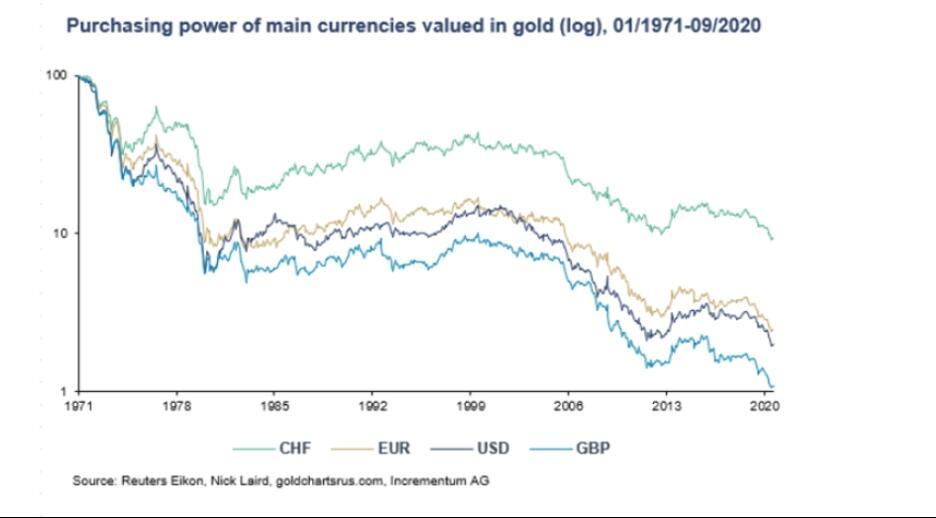 In 1971, when the USD lost its golden chaperone, money supply expansion, inflation and hence a gold price explosion followed, held in check only by Volcker’s aggressive, post-1980 rate hikes.