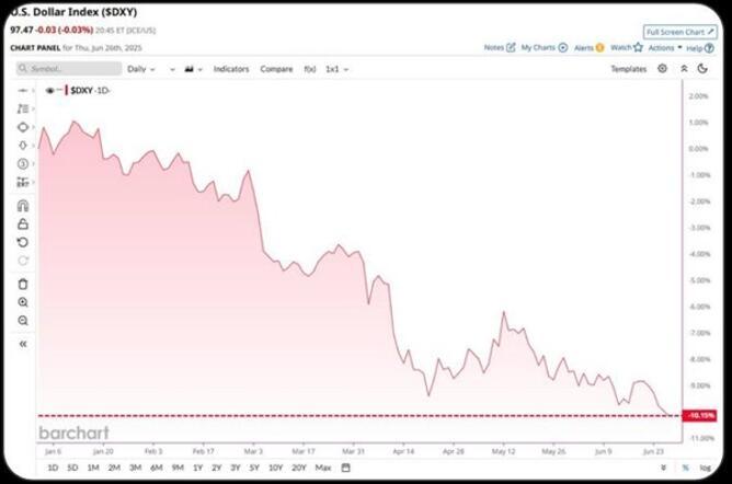 This year alone, the USD has lost 10% of its power and is seeing its worst first-half performance in nearly 40 years.