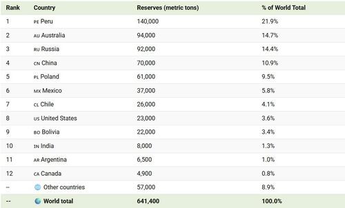 Behind Peru is a cluster of countries with substantial, but smaller, reserve bases. Australia, Russia, and China each hold between 70,000 and 94,000 metric tons, collectively accounting for about 40% of global reserves.