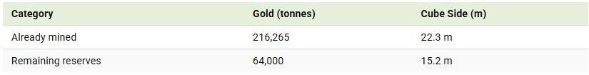 Meanwhile, the world’s proven, economically recoverable gold reserves total around 64,000 tonnes, forming a smaller 15-meter cube.