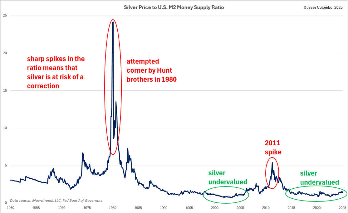 Another way to assess whether silver is undervalued or overvalued is by comparing it to various money supply measures. The chart below shows the ratio of silver’s price to the U.S. M2 money supply, providing insight into whether silver is keeping pace with, outpacing, or lagging behind money supply growth. If silver’s price significantly outpaces money supply growth, the likelihood of a strong correction increases. Conversely, if silver lags behind money supply growth, it suggests a potential period of strength ahead. Since the mid-2010s, silver has slightly lagged behind M2 growth, which, combined with other factors discussed in this piece, position it for a strong rally.