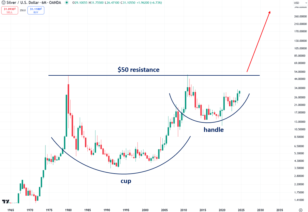 Even more exciting is the fact that silver’s logarithmic chart, dating back to the 1960s, reveals a cup-and-handle pattern, indicating the potential for silver to reach several hundred dollars per ounce during this bull market. In order to confirm this particular scenario, silver needs to close decisively above the $50 resistance level.