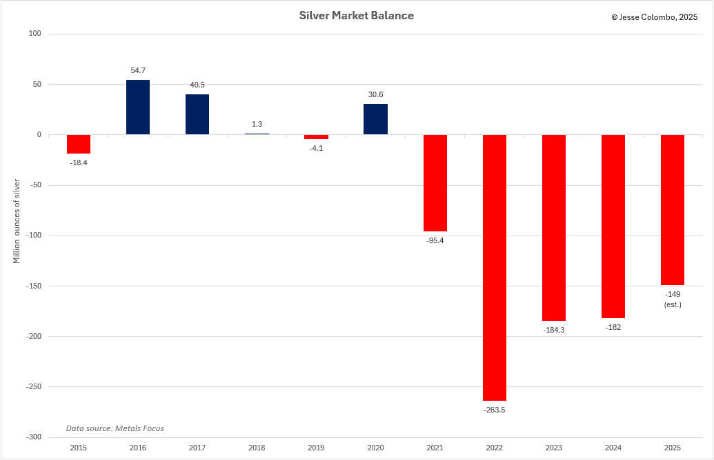 One key reason I believe silver will soon break free comes down to basic Economics 101: supply and demand. Over the past five years, silver demand has consistently exceeded supply, resulting in a persistent deficit—as shown in the chart below. In 2024 alone, the shortfall reached 182 million ounces, with an estimated additional 149 million ounces this year—and deficits are expected to continue for the foreseeable future. As a result, above-ground silver stocks are dwindling rapidly. While bullion banks can create unlimited amounts of paper silver to suppress prices, they can’t manufacture the real physical silver that is crucial for a wide range of industries, alongside growing investment demand.