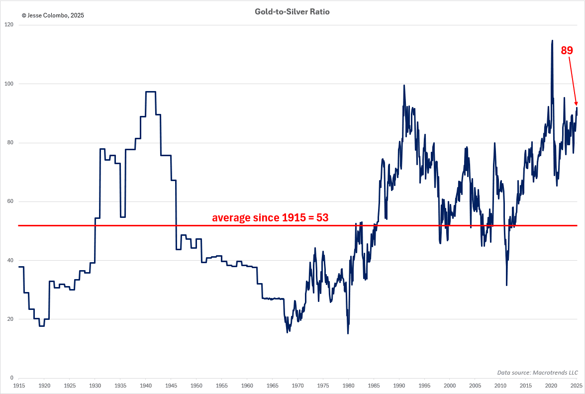 The long-term gold-to-silver ratio chart clearly shows that silver is significantly undervalued relative to gold, suggesting that silver has substantial upside potential. As silver rises to close this gap, the ratio would decline. The current gold-to-silver ratio stands at 89, but if it were to revert to its historical average of 53 since 1915—without any increase in gold’s price—silver would be valued at a solid $55 per ounce (as compared to the current price of $32.65).