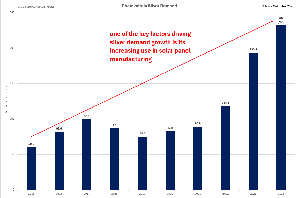 At the same time, demand for physical silver has skyrocketed across multiple sectors, with the biggest driver being the surge in solar panel manufacturing. As the world shifts away from fossil fuels toward renewable energy, this trend is only in its early stages. Silver demand for photovoltaic (solar panel) applications alone has nearly tripled over the past four years, increasing by an astonishing 143.1 million ounces. With global efforts to expand clean energy accelerating, this demand is set to grow even further.