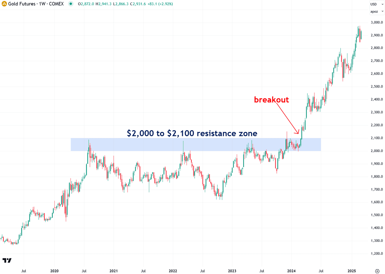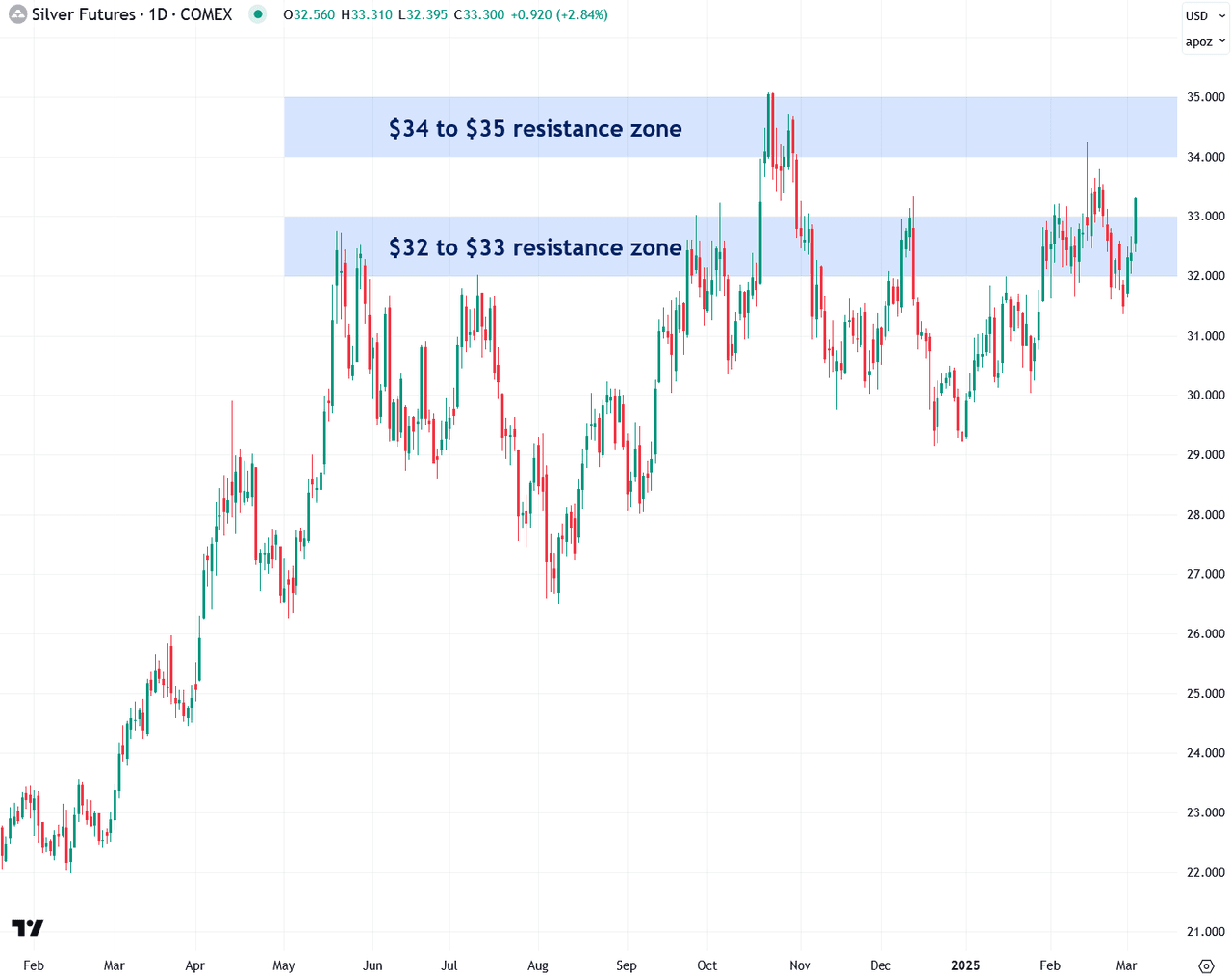 Also, take a look at the chart below and notice how gold struggled from 2020 to early 2024 to break above the $2,000–$2,100 resistance zone, which acted as a price ceiling for much of that period. Despite multiple attempts, gold was repeatedly pushed back down. However, in March 2024, it finally broke out, igniting the powerful bull market we see today. I see striking parallels with silver’s $32–$33 resistance zone over the past year and believe that once silver manages to close above this level, it will soar just as gold did.
