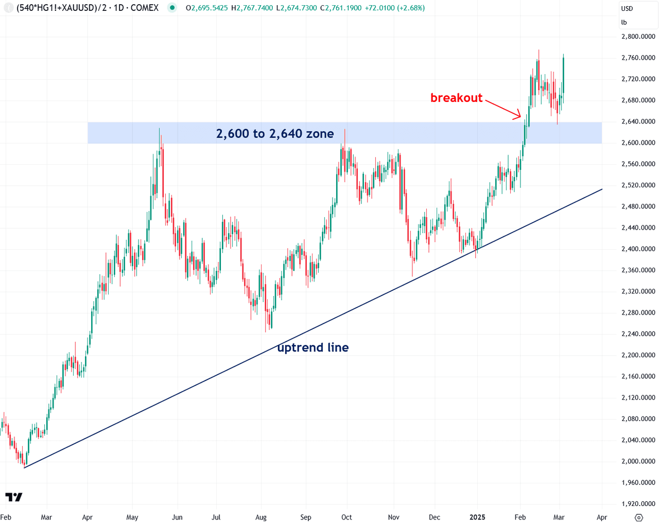 In addition to gold, copper is another key metal that strongly influences silver’s price, as I explained here. This understanding led me to develop the Synthetic Silver Price Index (SSPI)—an indicator designed to validate silver’s price movements and filter out potential fakeouts. The SSPI is calculated as the average price of gold and copper, with copper adjusted by a factor of 540 to ensure gold doesn’t disproportionately impact the index. Remarkably, despite silver not being an input, the SSPI closely mirrors silver’s price movements.