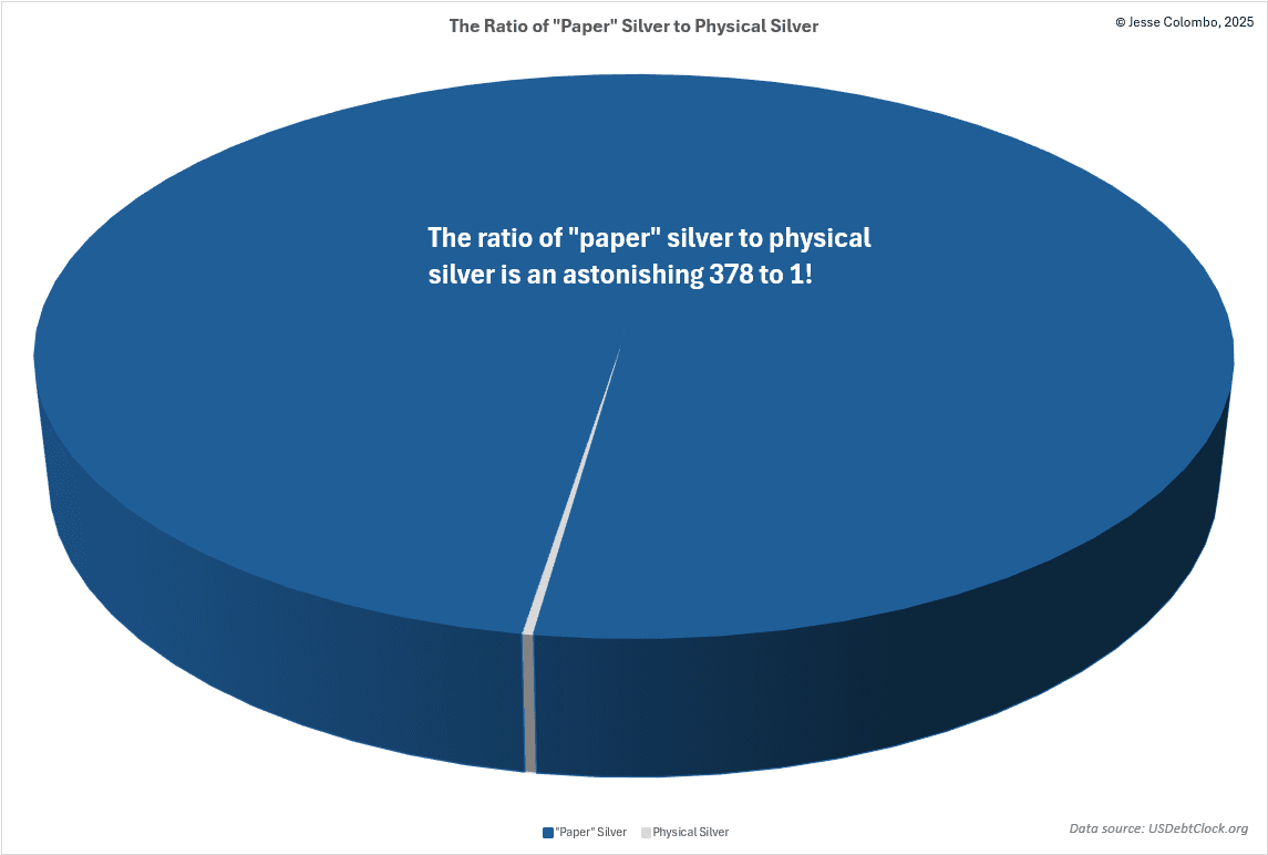 The risk of an explosive silver short squeeze is further amplified by the astonishing ratio of 378 ounces of "paper" silver—ETFs, futures, and other derivatives—for every single ounce of physical silver. In a violent short squeeze, holders of "paper" silver could be forced to scramble for the extremely scarce physical silver to fulfill their contractual obligations. This would cause the price of "paper" silver products to collapse, while physical silver prices would skyrocket to jaw-dropping levels, potentially reaching several hundred dollars per ounce (this event is what may fulfill the price target implied by the cup and handle pattern I showed earlier).