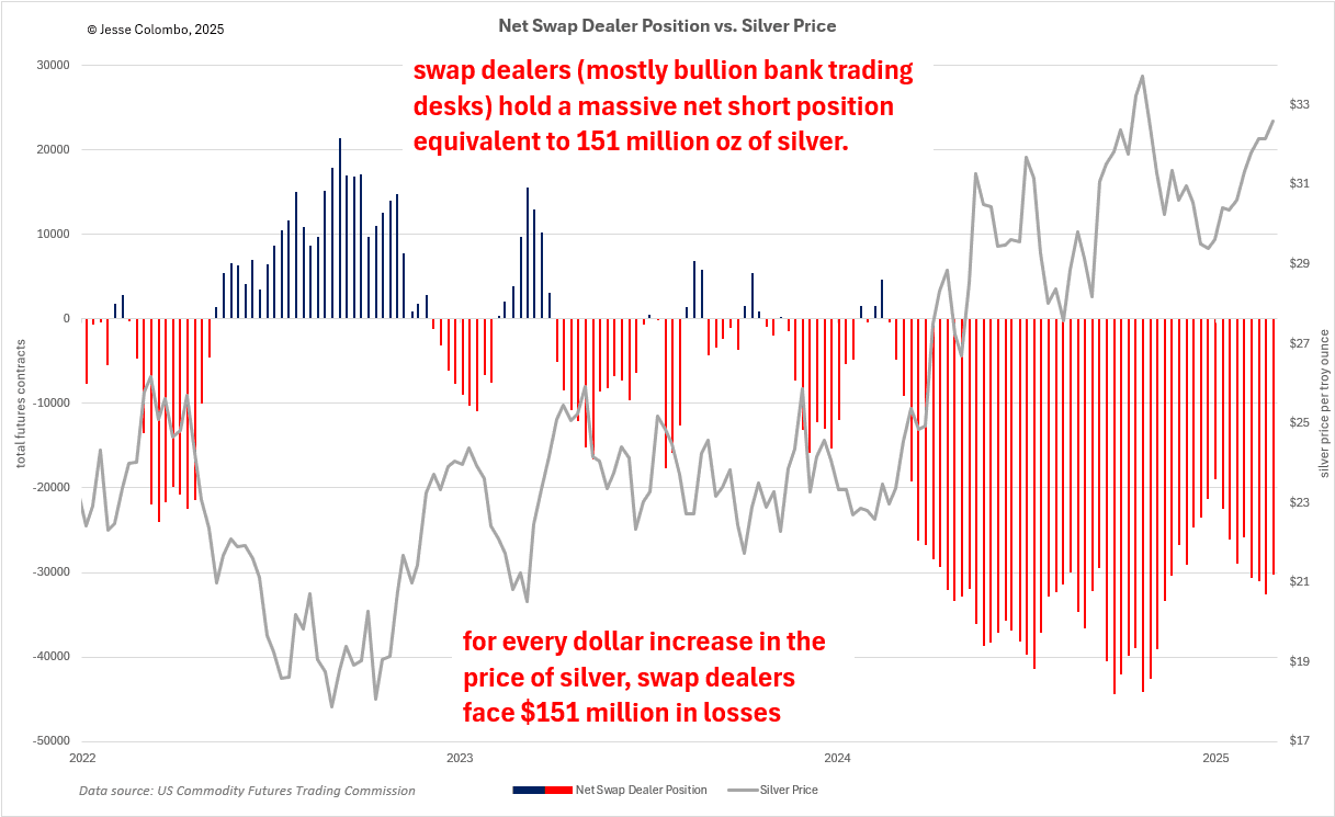 If the buying pressure is intense enough, it could even lead to a short squeeze, dramatically amplifying silver’s upward momentum. Given the sheer size of their short position, bullion banks stand to lose approximately $151 million for every $1 increase in the price of silver—a setup for a major price surge. Now, just imagine what will happen as silver climbs by $5, $10, $20, and beyond from this point.