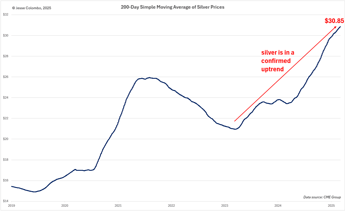 Although silver has traded in a choppy, erratic manner for much of the past year, it is in a confirmed uptrend, despite grinding higher in a frustrating “two steps forward, one step back” manner. This is evident in the 200-day simple moving average, a helpful tool for identifying an asset’s primary trend by filtering out short-term price fluctuations.