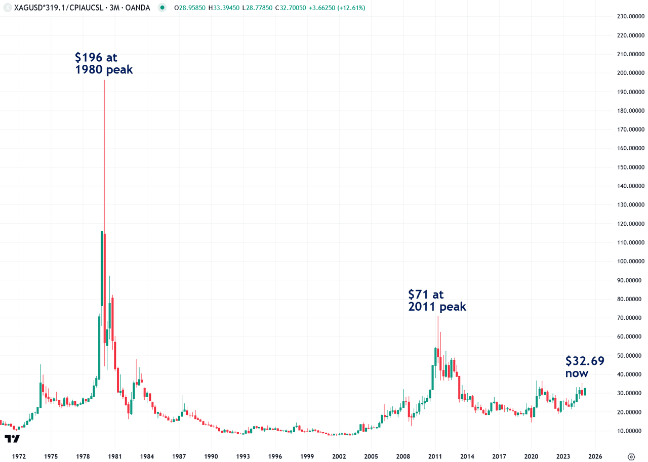 Adjusting silver’s price for inflation further highlights how undervalued it is by historical standards. During the Hunt brothers-induced spike in 1980, silver reached an inflation-adjusted price of $196. In the 2011 bull market, driven by quantitative easing, it hit $71. Currently trading at just $32.69, silver has significant room to rise if it’s to catch up with these previous inflation-adjusted peaks.