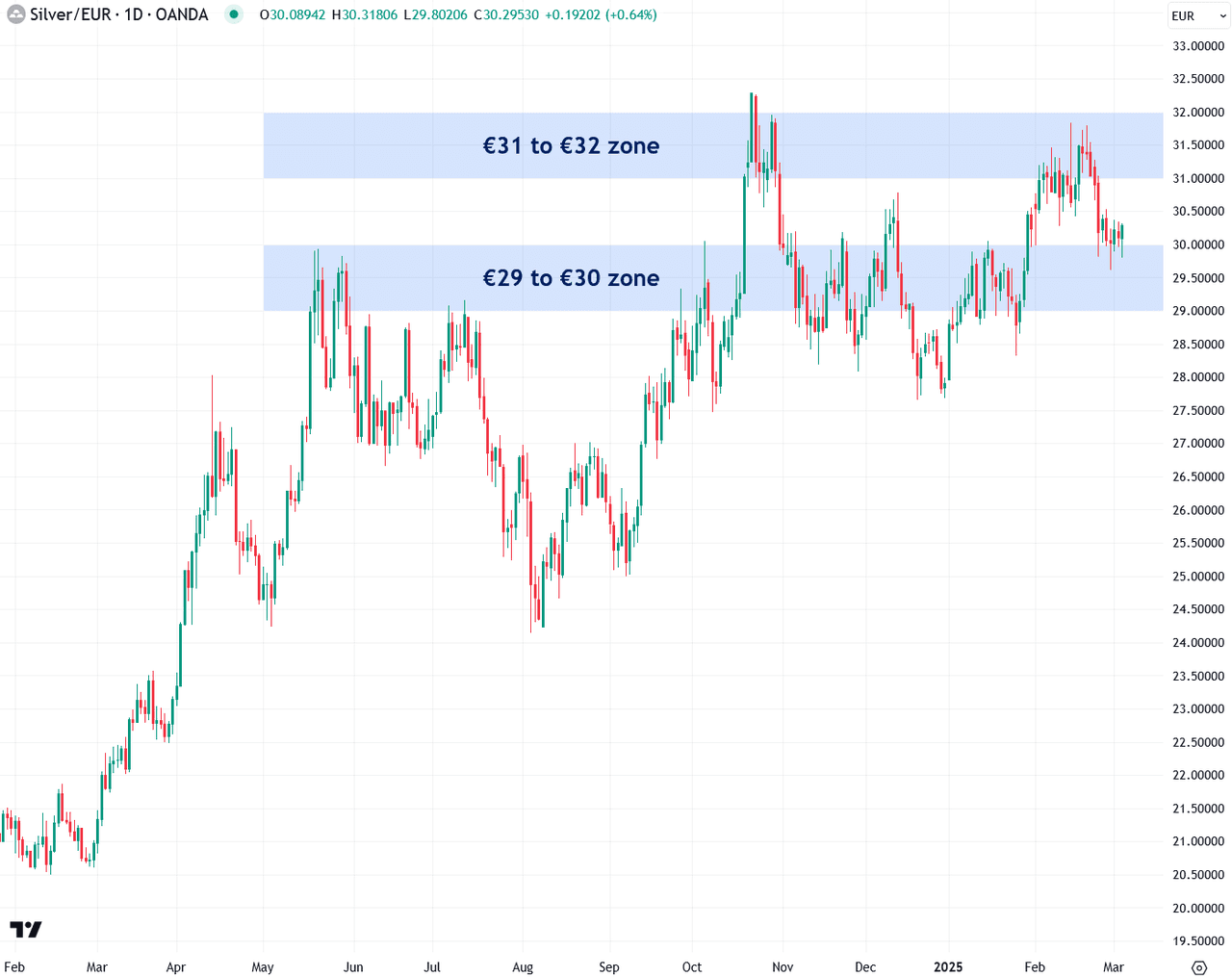 I closely monitor silver priced in euros because it provides valuable insights by stripping away the influence of U.S. dollar fluctuations, offering a clearer view of silver’s intrinsic strength. In euro terms, silver tends to respect key levels such as €30, €31, and €32, forming well-defined areas of support and resistance.