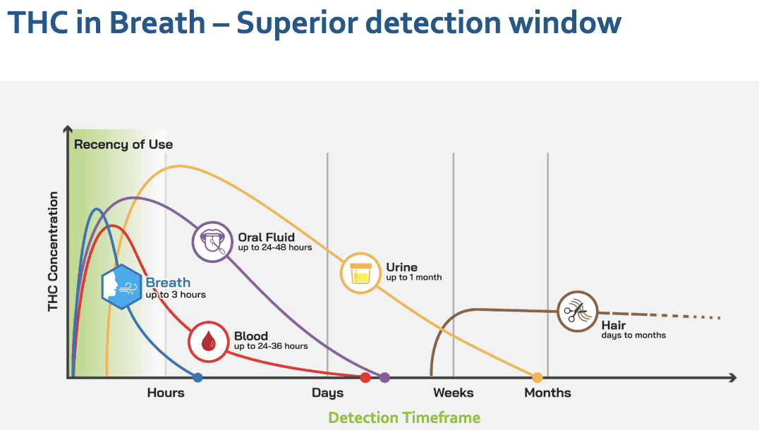 Second, a THC testing device must be based on breath, not urine, oral fluids, or hair fibers. Only a breath test can determine objectively whether the substance has been consumed within the last one to three hours, the peak window of impairment. These other legacy methods can just show whether THC has been used in recent days, weeks, or even months, hardly conclusive indicators of current impairment.