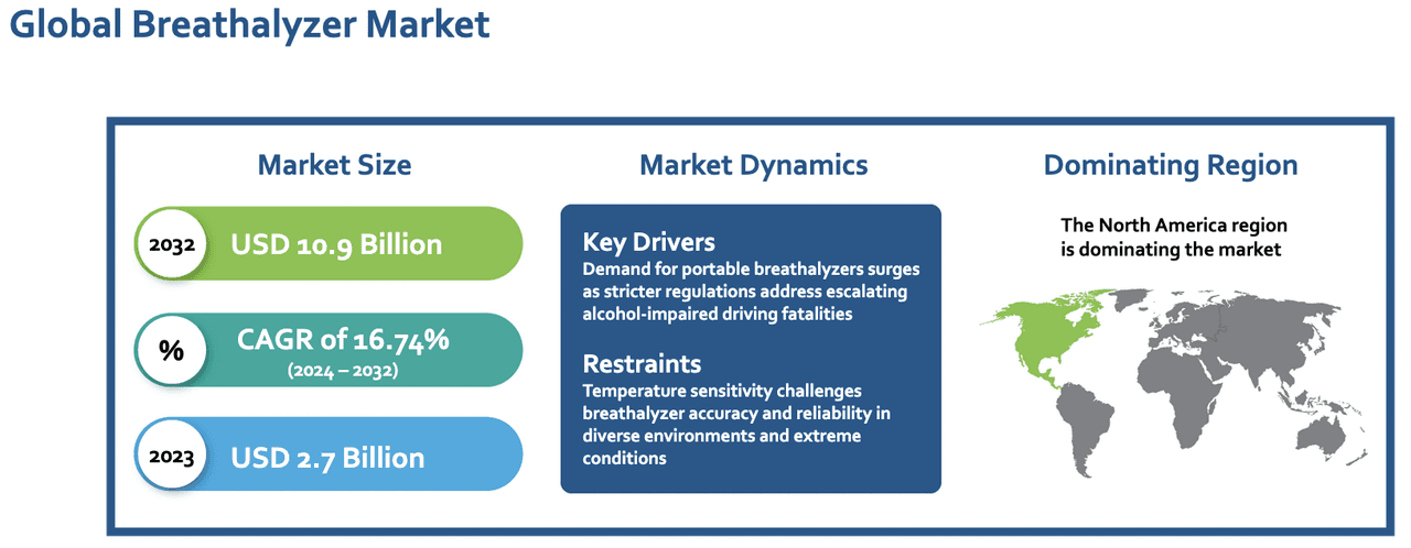 - Phrased simply, Cannabix has developed a unique technology product for which there is tremendous demand, in particular for portable breathalyzers. The breathalyzer market totaled US$3.15 billion in 2024 and is expected to more than triple to US$10.9 billion by 2032. Given the size of this opportunity and its first mover advantage, Cannabix’s share price (total stock market capitalization of just C$63 million) has enormous upside potential.