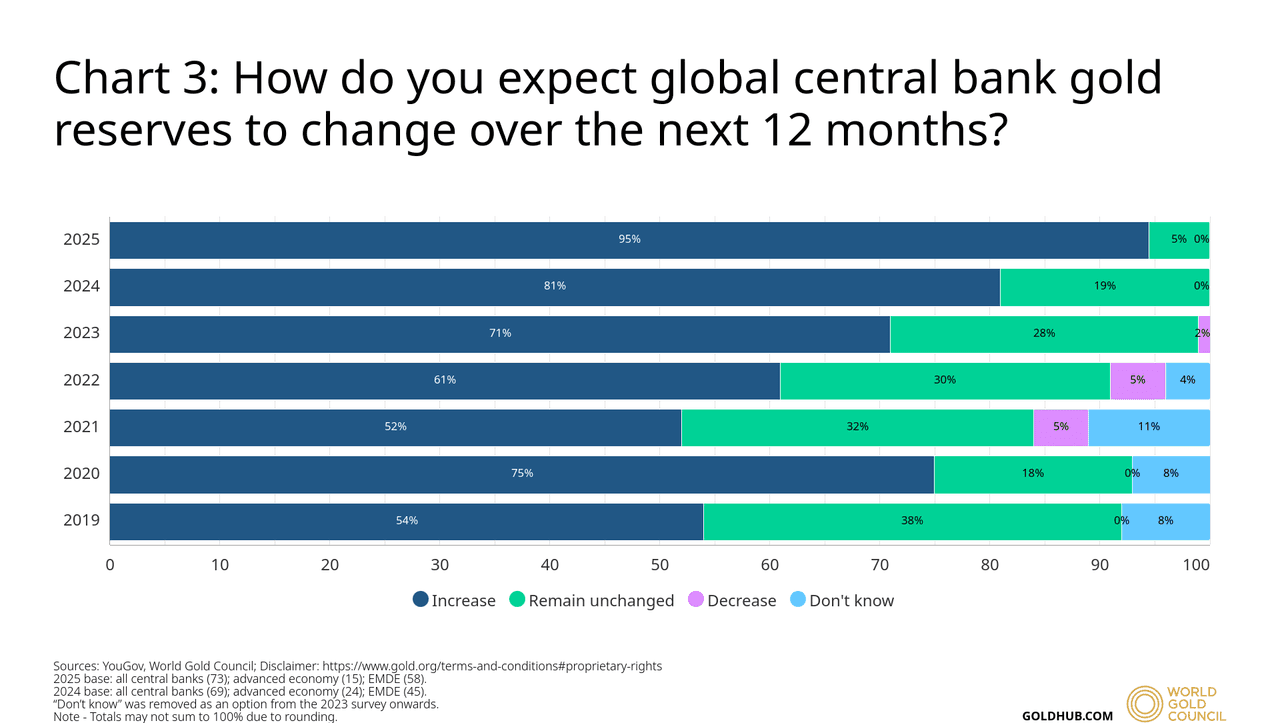 - 95% of central banks expect global gold holdings to increase or remain stable over the next 12 months.
