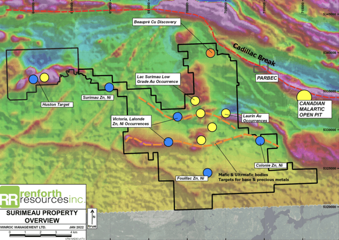 - Surimeau could potentially be a large and very valuable polymetallic resource, and investors have paid little attention to its potential. Importantly, Renforth has the financial capability to drill the property to determine its size and metal composition. The company is currently designing a drill program in the central area of the 20-km Victoria mineralized structure. The drilling program should commence this winter.