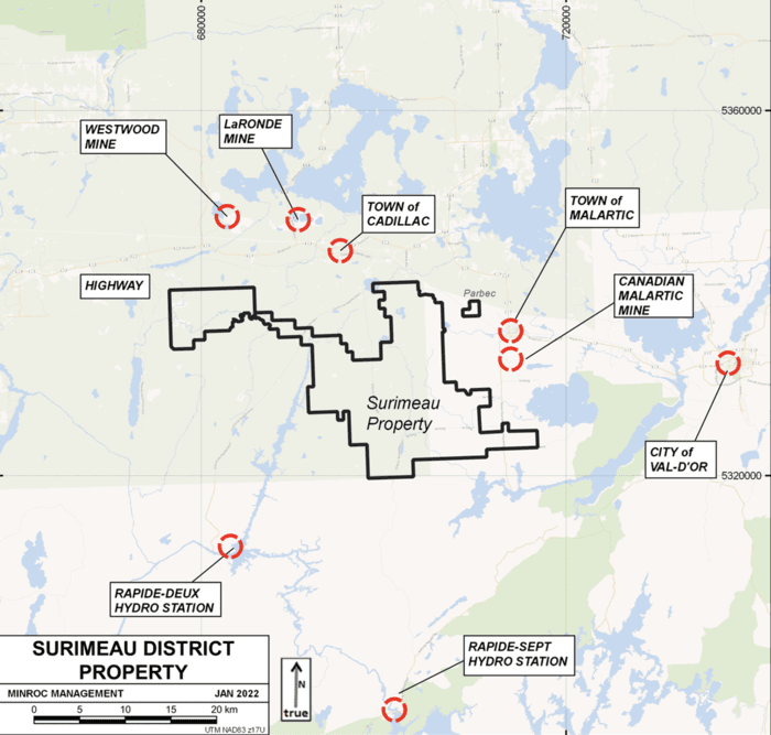 Surimeau’s location in southern Quebec is advantageous from the perspectives of both labor and infrastructure. Not only can it be accessed by paved roads in a region where inexpensive hydroelectric power is available, but Surimeau is near established mining towns such as Malartic, Val d'Or and Rouyn-Noranda, as well as operating mines like Canadian Malartic, LaRonde, Westwood, and others. See Figure 2.