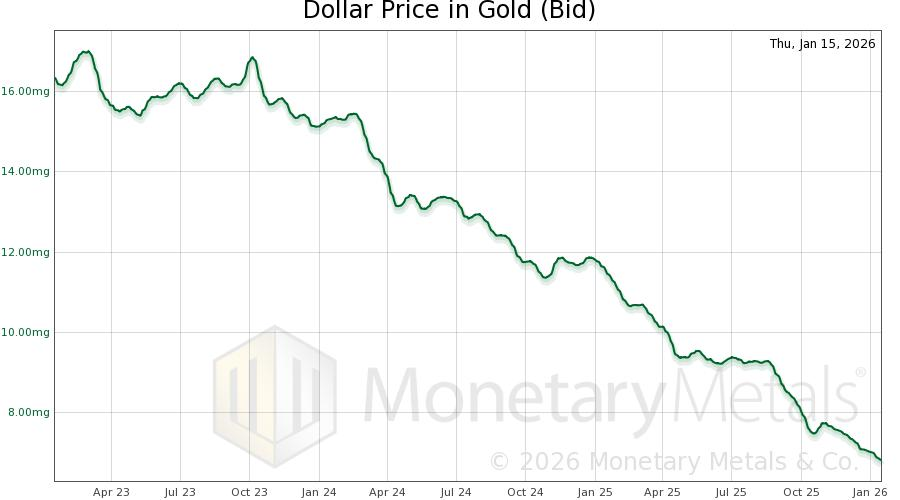 Measured in gold, the dollar has declined steadily for decades. In 1996, one dollar bought more than 120 milligrams of gold. Today, it buys less than 10.