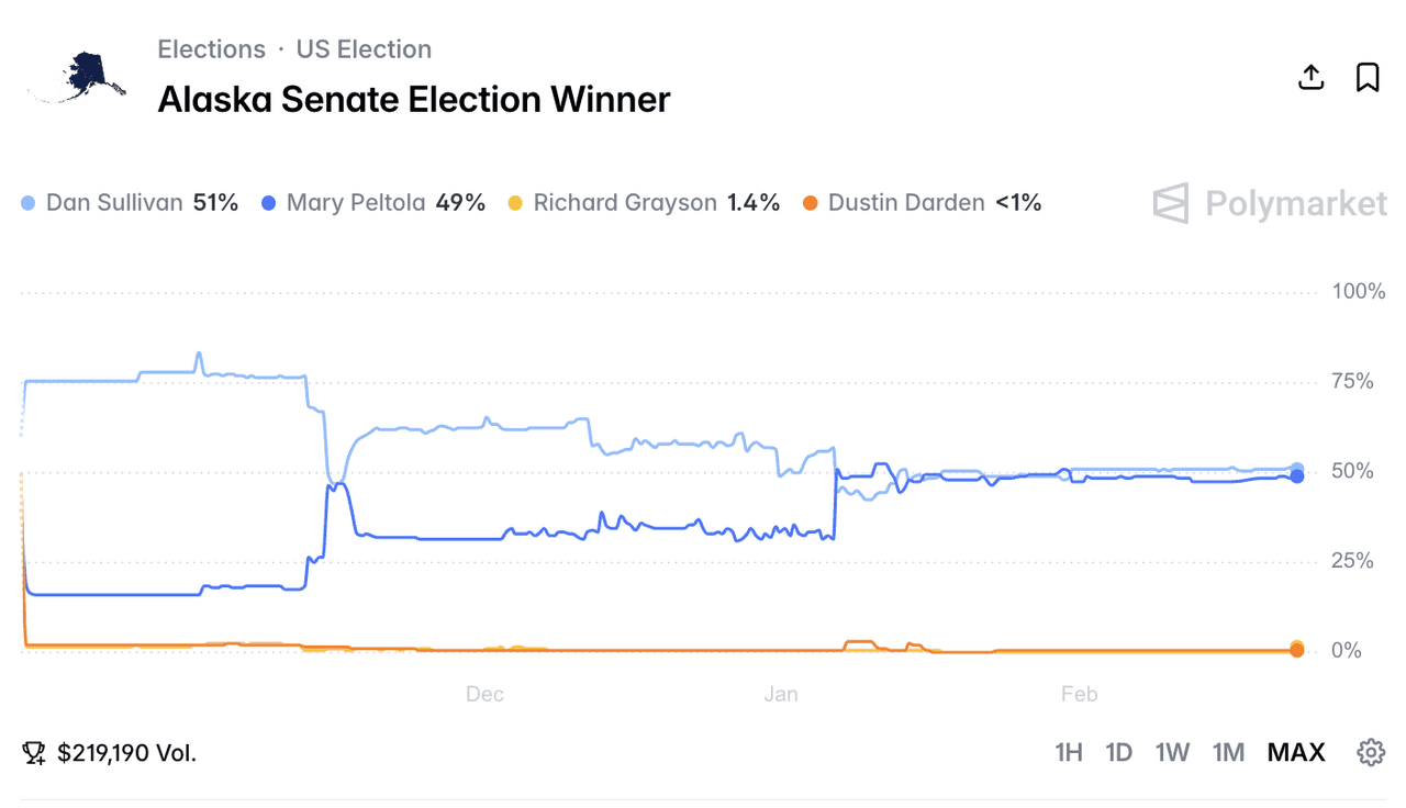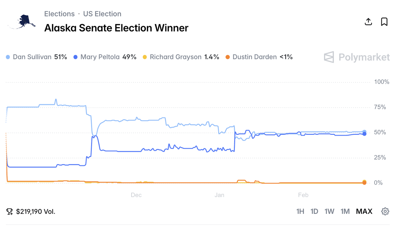 He's an incumbent, Trump's energy agenda is popular in Alaska, and there will be fear about a Democrat obstructing those policies. I'd put Peltola's chances at about 25%.