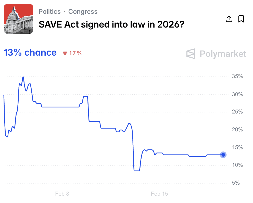 The SAVE Act is one. It passed the House and would require proof of citizenship to register to vote, plus voter ID provisions. The Senate doesn't have 60 votes, so Thune is looking at ways to get it across the finish line with just 50, but even that's iffy given Murkowski, Collins, and McConnell.