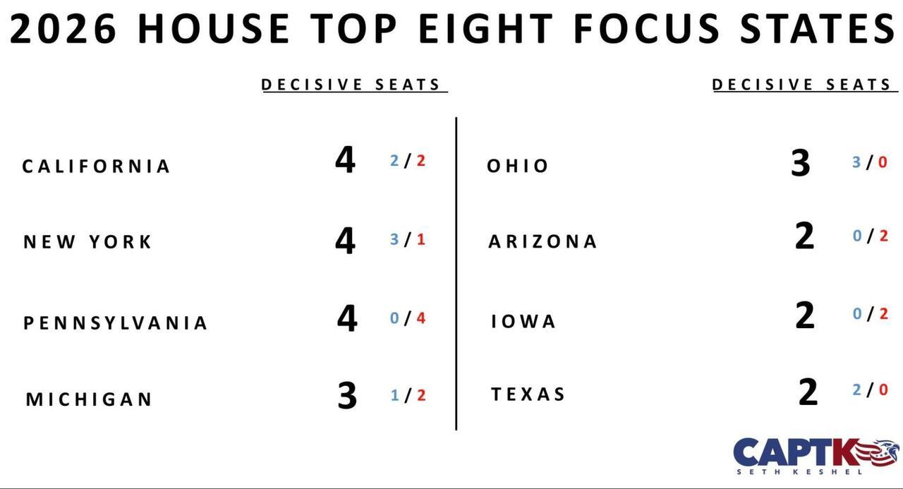 I consider 396 of 435 House seats to be safely predicted. That leaves 39 seats that will decide the majority. The states with the most competitive races in that 39 are California, New York, Pennsylvania, Michigan, Ohio, Arizona, Iowa, and Texas.