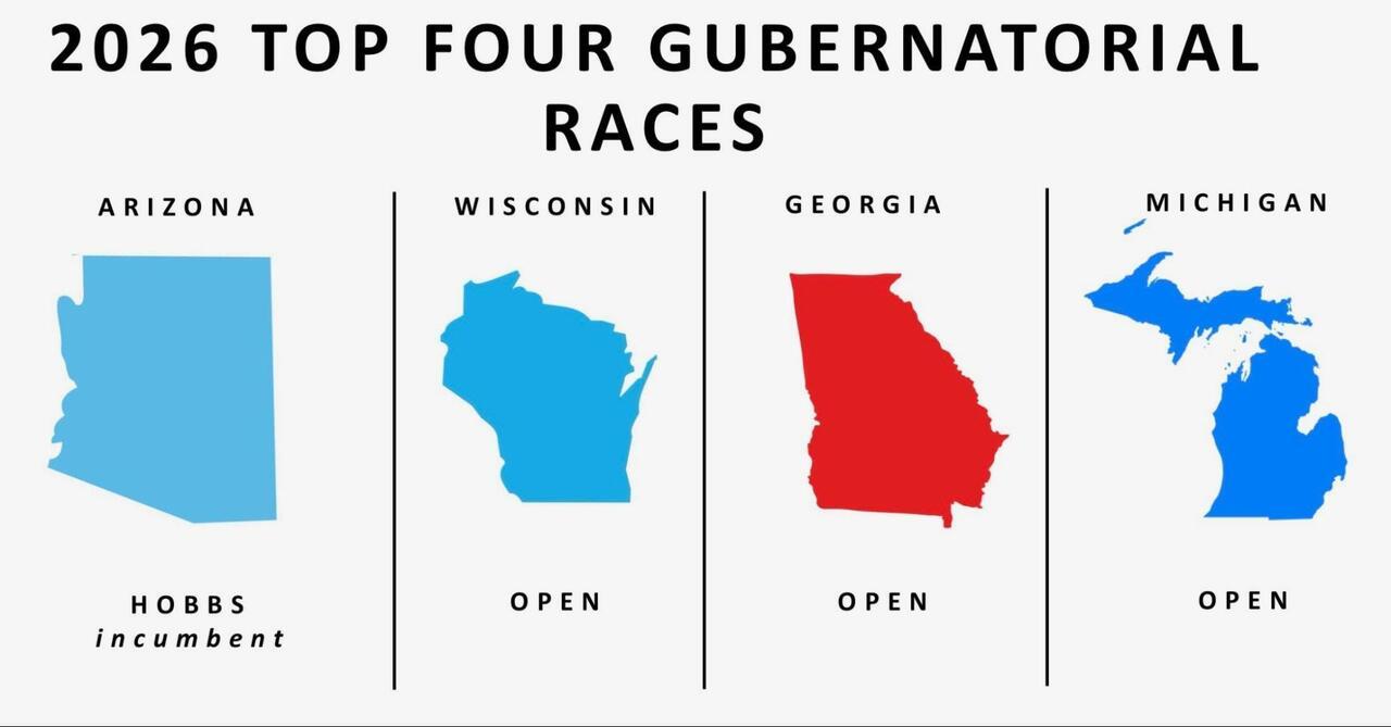 Georgia has an open seat and it's a mess. You've got Keisha Lance Bottoms likely for the Democrats and a bunch of establishment Republicans like Brad Raffensperger and Chris Carr who don't excite the base. I give Republicans a 55-45 edge to hold that governorship.