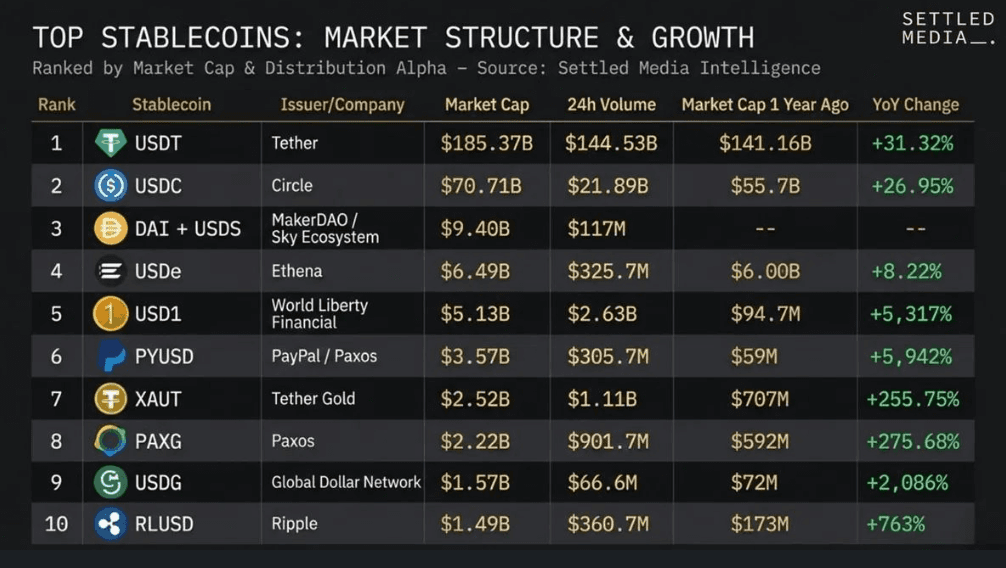 Stablecoin market caps continue to expand year over year. USDT alone grew more than 31% year-over-year, USDC grew nearly 27%, and new entrants like USD1 and PYUSD have posted triple- and quadruple-digit growth rates, albeit from smaller bases.