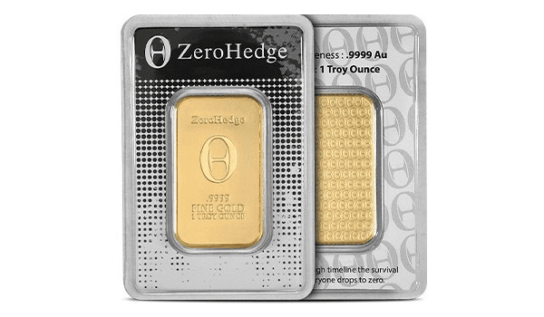 The 1 oz ZeroHedge Gold Bar is .9999 fine gold, sealed in an assay blister pack for authenticity.