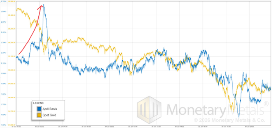 On Friday January 30, the basis and price move together. This is selling of futures, we assume a giant flush of leverage in the market. Note that spike up in the basis, around 50bps. This is buying of futures, but it’s not enough to hold the price up against the selling of metal.