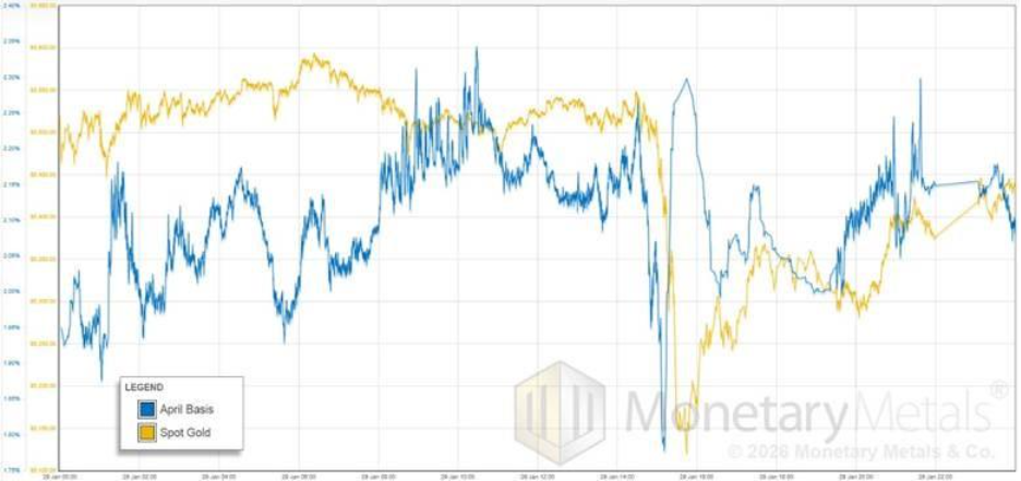 With that big increase in price on Wednesday January 28—from $5,150 to $5,550—the basis drops from 2.8% to 1.8% (the part near the right side, where price and basis show a straight line is after the New York close and before the Globex open).