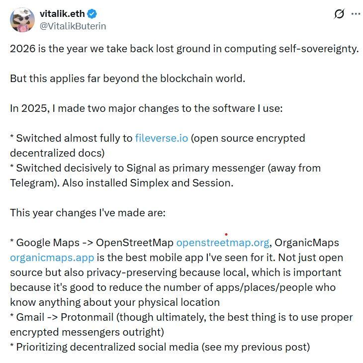 Ethereum cofounder Vitalik Buterin declared 2026 to be the “year we take back lost ground in computing self-sovereignty,” starting with his own devices.