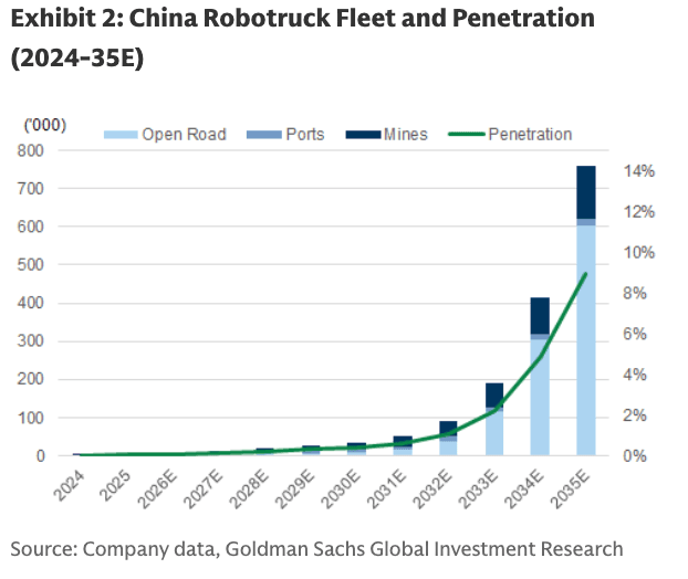 Chang forecasts that robotrucks could emerge as a long-term growth market, with China's fleet rising from 8,000 in 2026 to 760,000 by 2035.