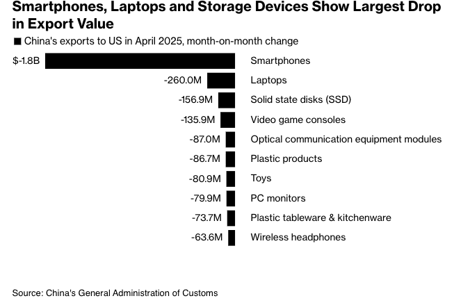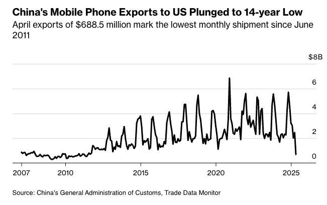 New customs data from China shows that smartphone shipments to the U.S. collapsed 72% in April to below $700 million—the lowest level since 2011. The plunge coincided with the peak of the U.S.-China trade war, as the Trump administration imposed up to 145% tariffs on Chinese goods, disrupting tech supply chains. However, those levies have since been significantly scaled back to 30% as of May.