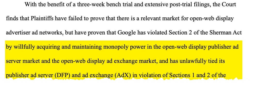 Here are the key findings in the landmark antitrust case (U.S. v. Google, 23-cv-00108, U.S. District Court, Eastern District of Virginia (Alexandria):