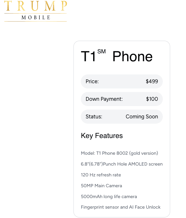 The Trump Organization stated that the "T1 Phone" will be a "sleek, gold smartphone engineered for performance and proudly designed and built in the United States for customers who expect the best from their mobile carrier."