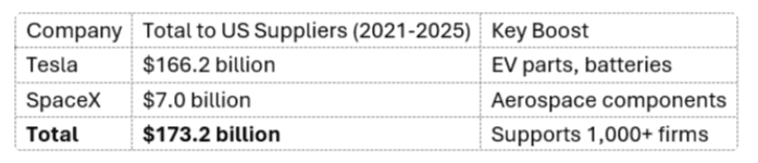 Musk doesn't hoard; he spreads the wealth to US suppliers. Tesla alone dropped $166 billion on American vendors for batteries, chips, and steel—propping up factories in Michigan and Nevada. SpaceX, with its "buy American" ethos, added $7 billion, mostly for rocket-grade alloys and avionics from domestic shops. xAI Together, that's $173 billion funneled to thousands of small and mid-sized firms, creating indirect jobs and steeling supply chains against global hiccups.