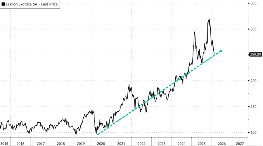 Since the Meta Ray-Bans launched in September 2023, shares of EssilorLuxottica in Europe have nearly doubled, though they've more recently pulled back about 21% from the high reached in late 2025.