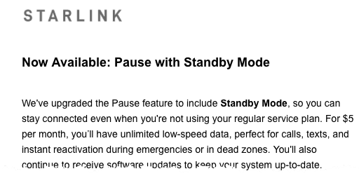 Starlink has introduced a new $5-per-month "Standby Mode," giving customers unlimited low-speed data for calls, texts, and instant reactivation during emergencies or in dead zones, according to a new company email.