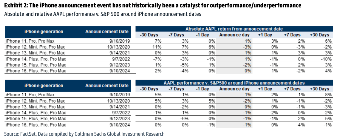 iPhone announcement event has not historically been a stock catalyst for outperformance/underperformance