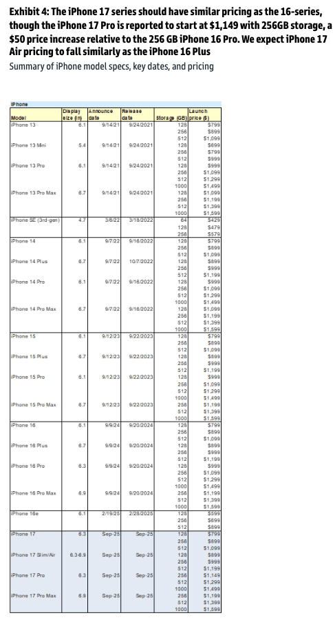 "We are encouraged by reports surrounding (1) form factor updates to iPhone 17 models (17 "Air" model, larger base screen size); (2) the potential for a price increase to the iPhone 17 Pro; and (3) continued carrier competition driving device-related promotions," Ng told clients.